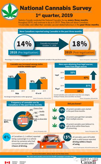 从1923年加拿大全面禁止大麻的使用,到2007年允许药用大麻,加拿大对于大麻的限制不断放宽。自从2018年大麻合法化后,加拿大人(大于15岁)使用大麻的人数从14% (2018第一季度)升至18%(2019第一季度)【4】。有趣的是,大麻在男性中的使用率在这一年中呈现明显上升,而其在女性中的使用率并没有明显变化。合法购买大麻的人群从2018年的23%上升到47%,非法购买大麻的人群也从51%降到了38%【4】。