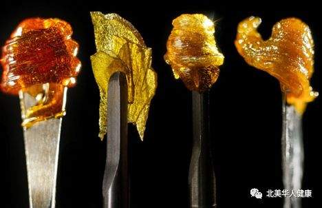 树脂浓缩物通过丁烷提取方法提取THC制成的,最终产品是浓稠的棕绿色物质,类似于耳垢或蜂蜜【14】。“Dabbing”这个俗称是指浓缩物接触热表面然后吸入蒸气的动作(图源:CannabisNow)