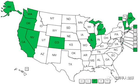 地图上的绿色部分为大麻在美国合法化的州和特区(图源【5】)